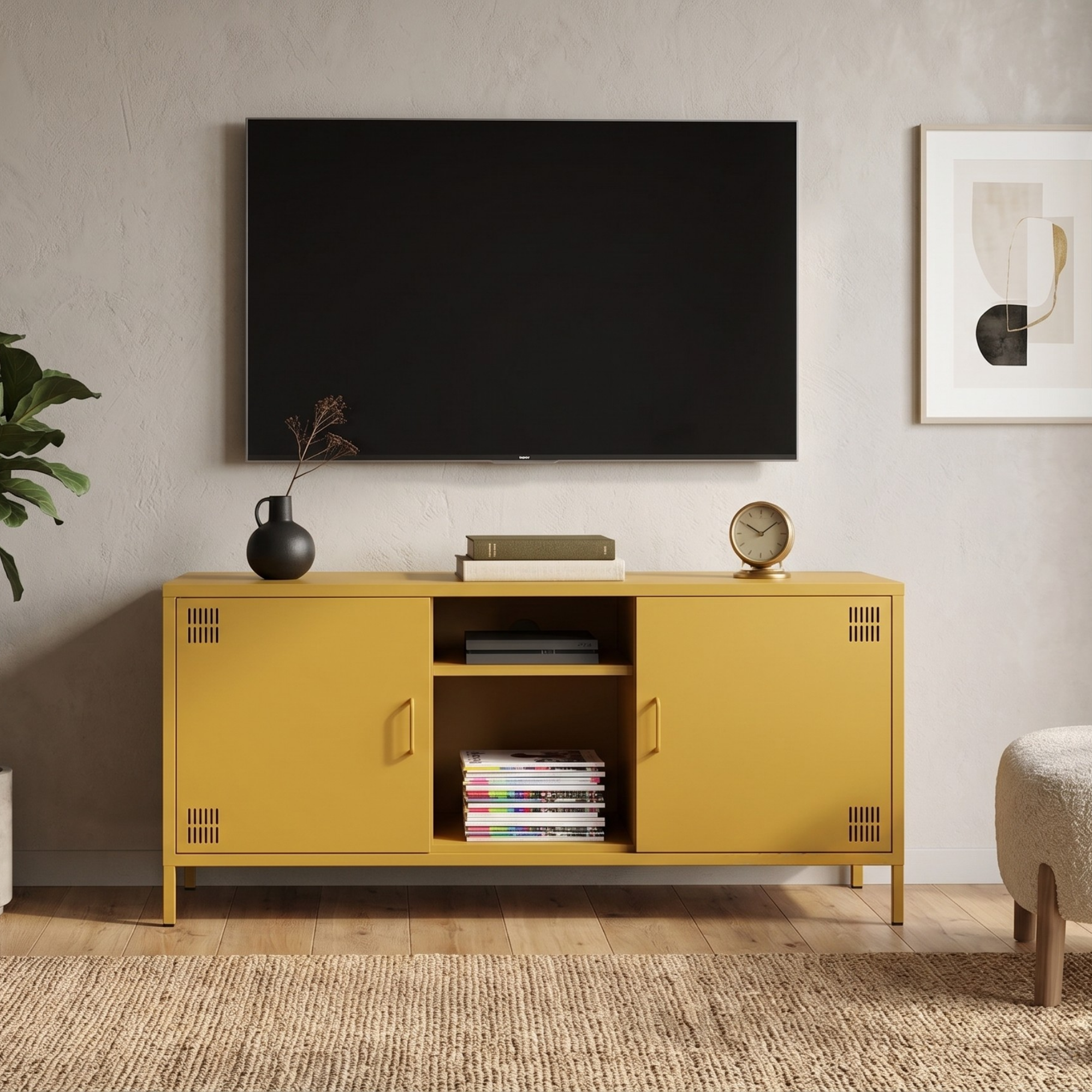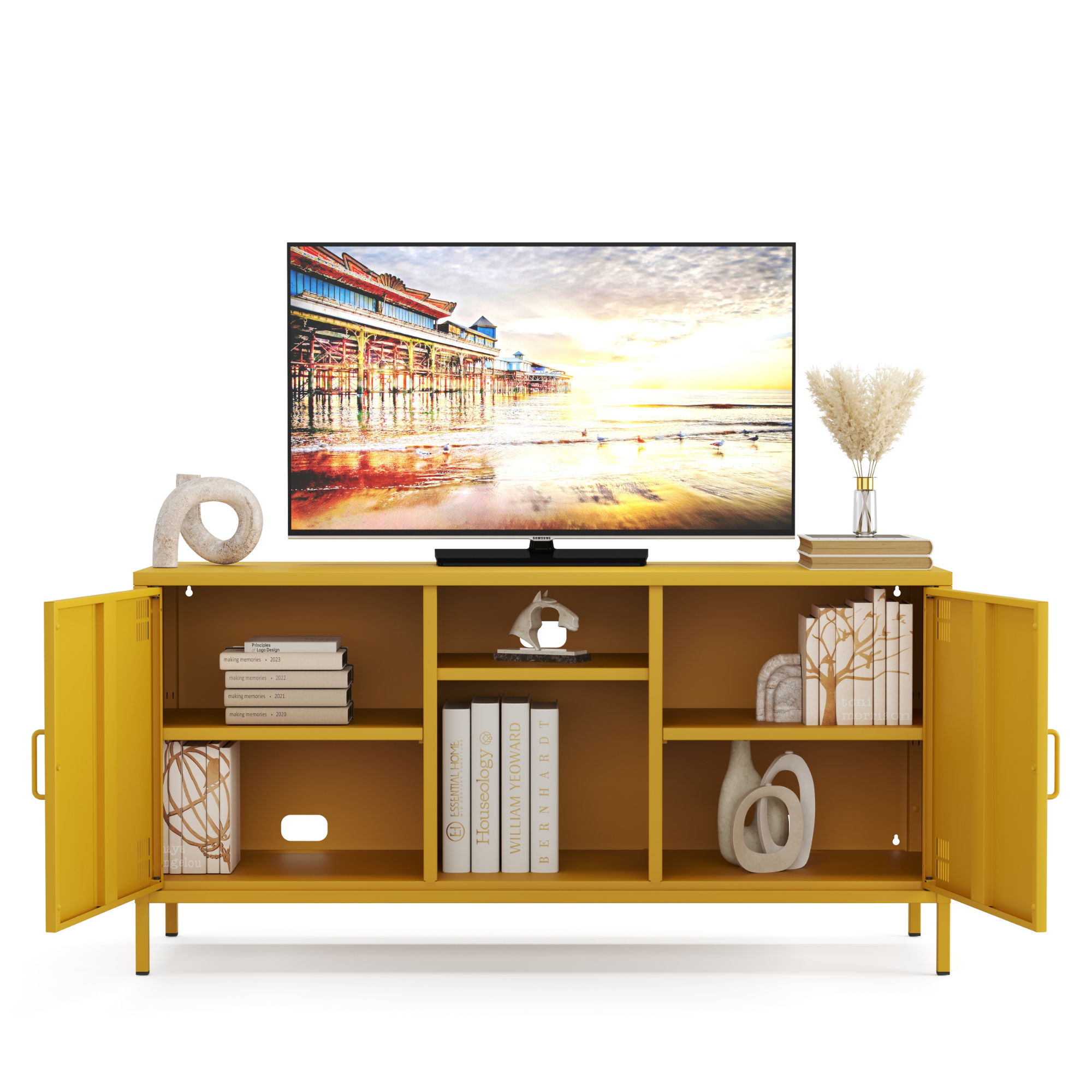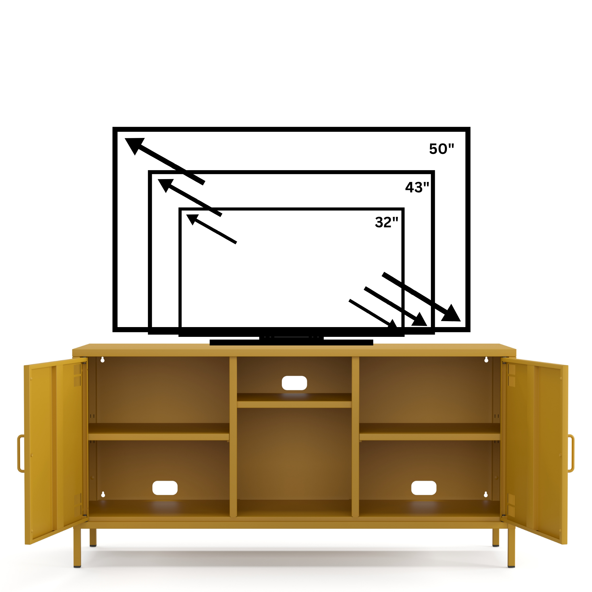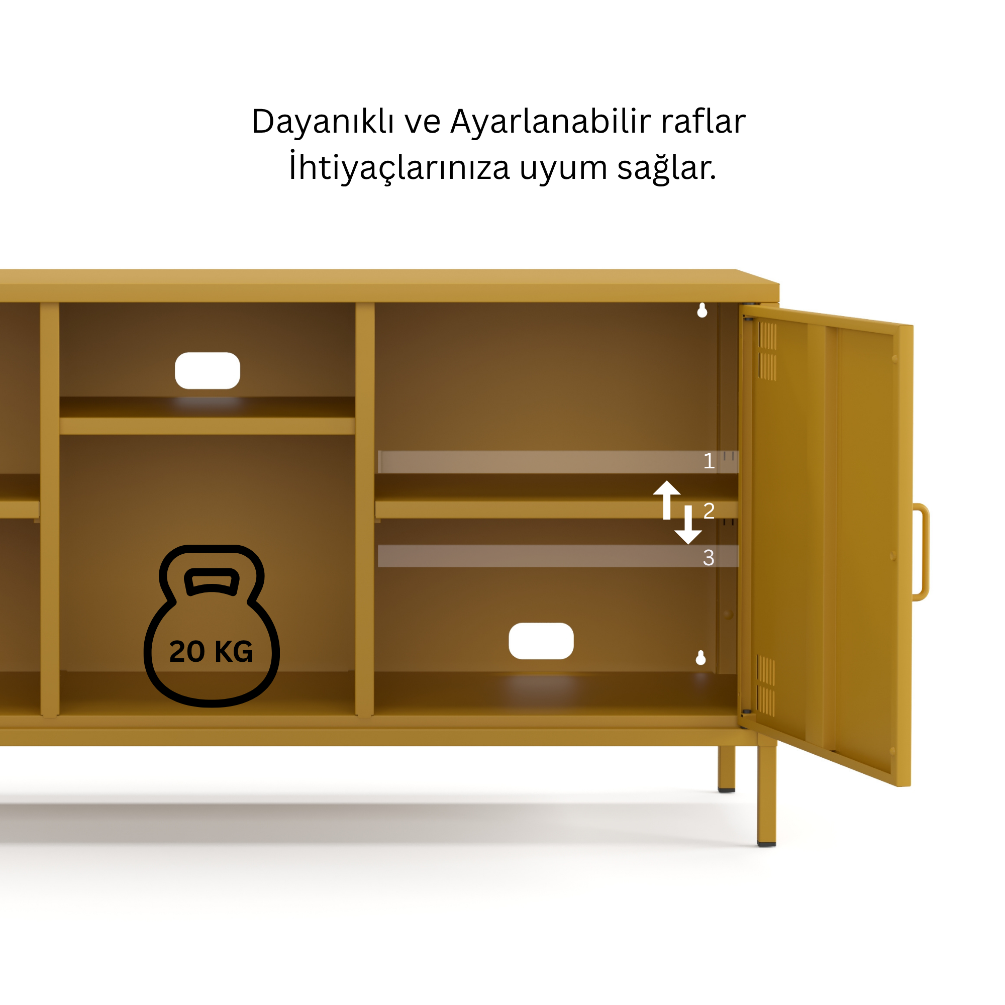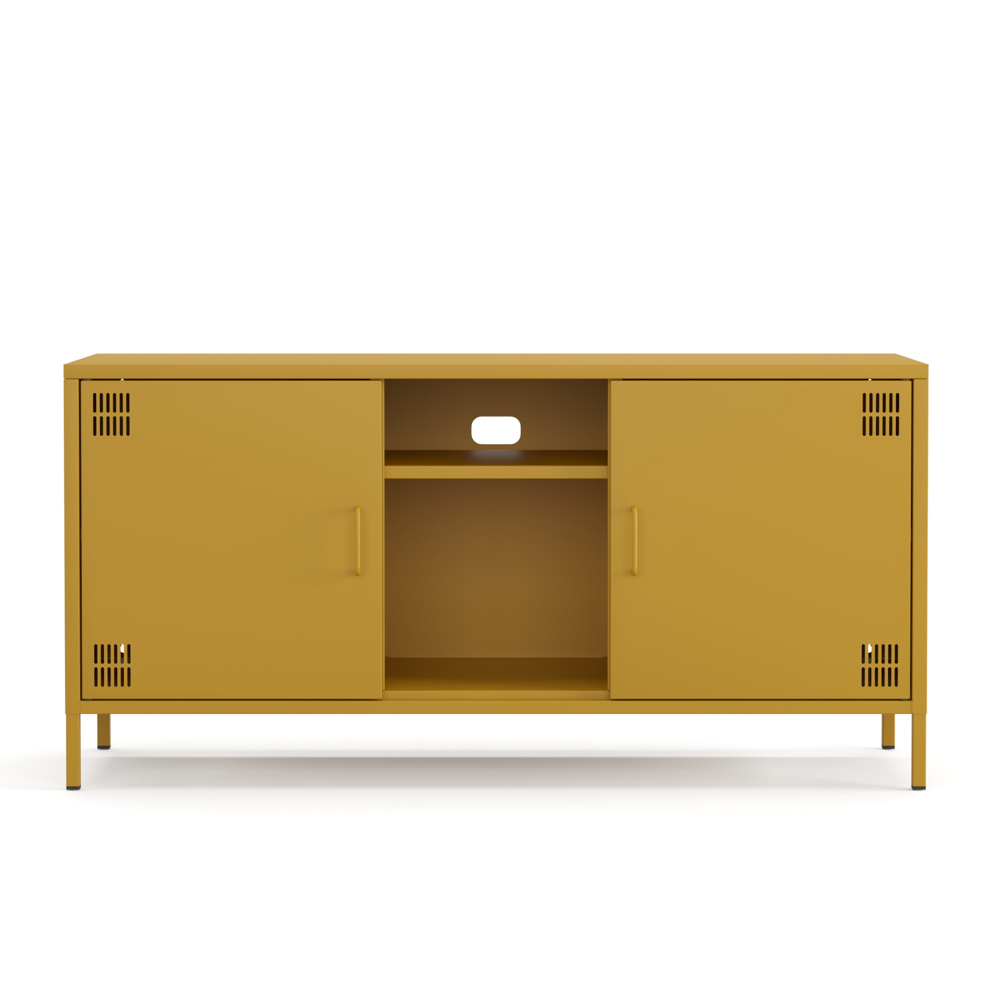 Pera Metal Tv Ünitesi, Tv Dolabı,2 Kapaklı, Açık Raflı 130,50 x 40 x 64,50 cm - Ral 1032 Hardal Rengi